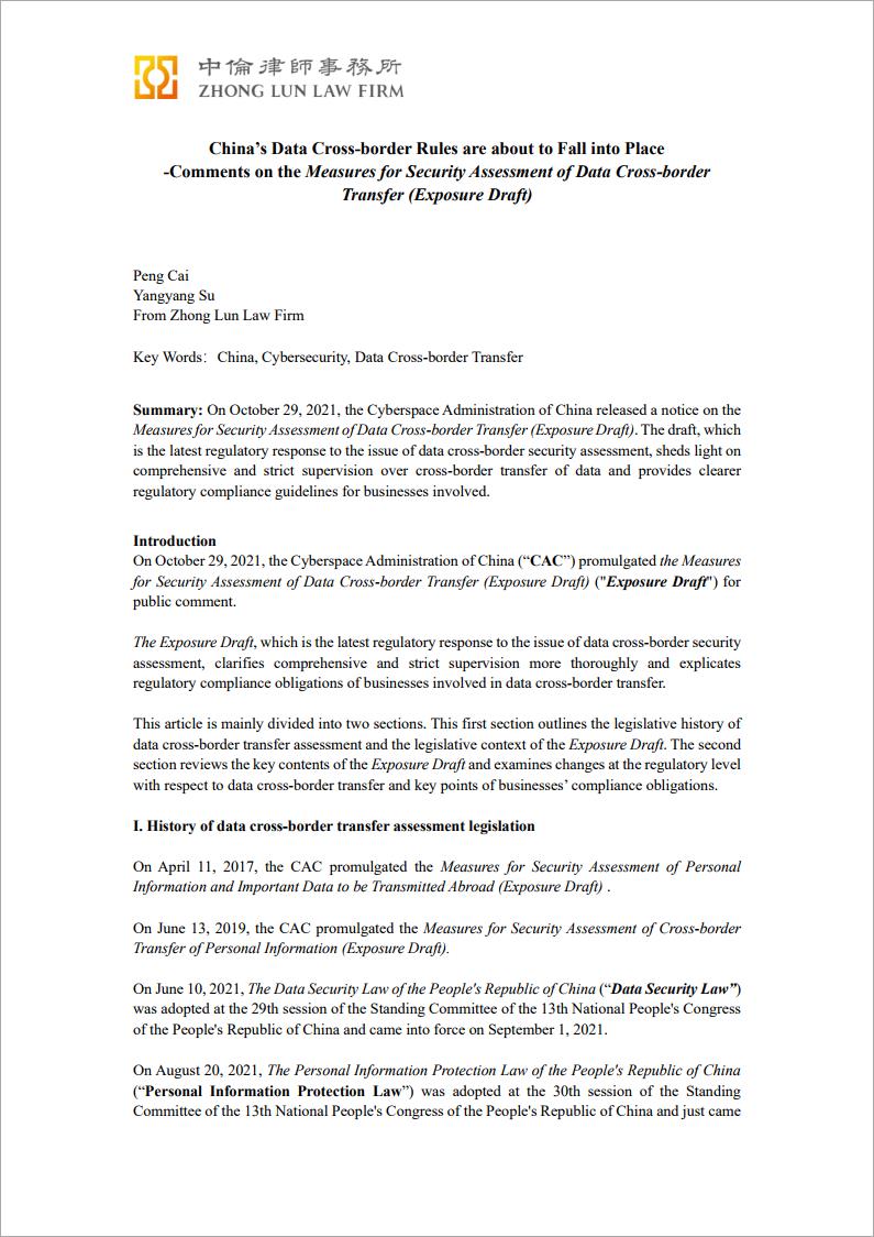 Title: China’s Data Cross-border Rules are about to Fall into Place-Comments on the Measures for Security Assessment of Data Cross-border Transfer (Exposure Draft)