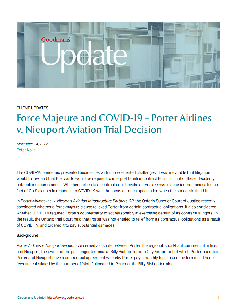 In Porter Airlines Inc. v. Nieuport Aviation Infrastructure Partners GP, the Ontario Superior Court of Justice recently considered whether a force majeure clause relieved Porter from certain contractual obligations. It also considered whether COVID-19 required Porter’s counterparty to act reasonably in exercising certain of its contractual rights. In the result, the Ontario trial Court held that Porter was not entitled to relief from its contractual obligations as a result of COVID-19, and ordered it to pay substantial damages.