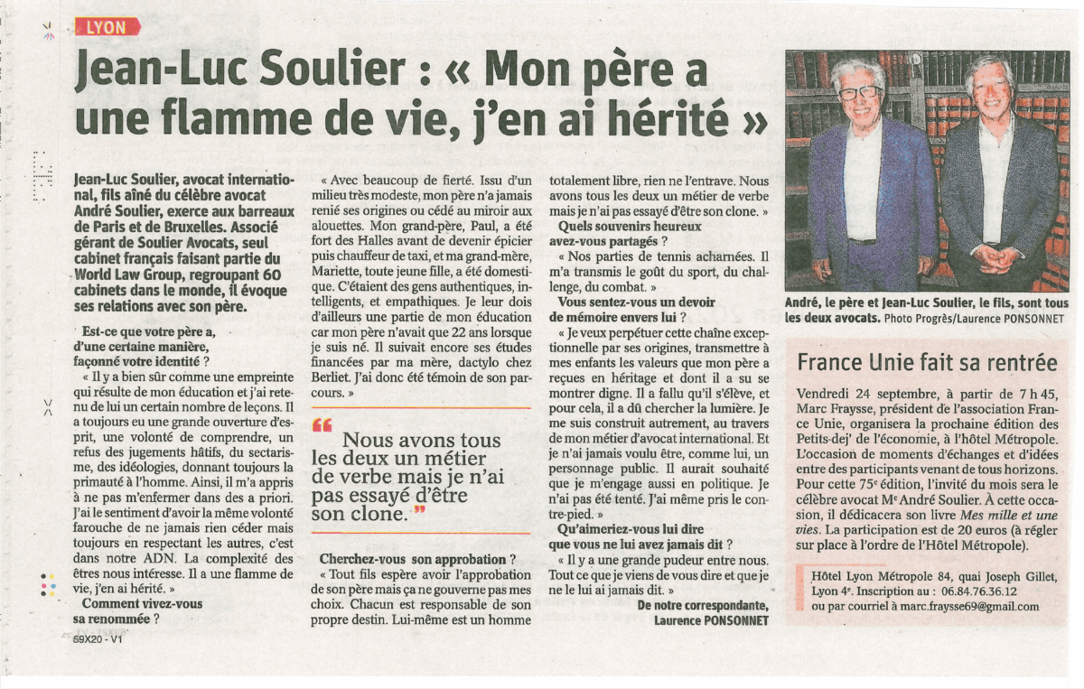 In this article published in Le Progrès in early September, Jean-Luc Soulier evokes his roots and recalls the history that shaped the Soulier law firm.