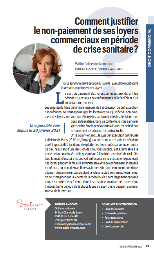 Guide Juridique 2021 de la Tribune de Lyon : « Comment justifier le non-paiement de ses loyers commerciaux en période de crise sanitaire ? »