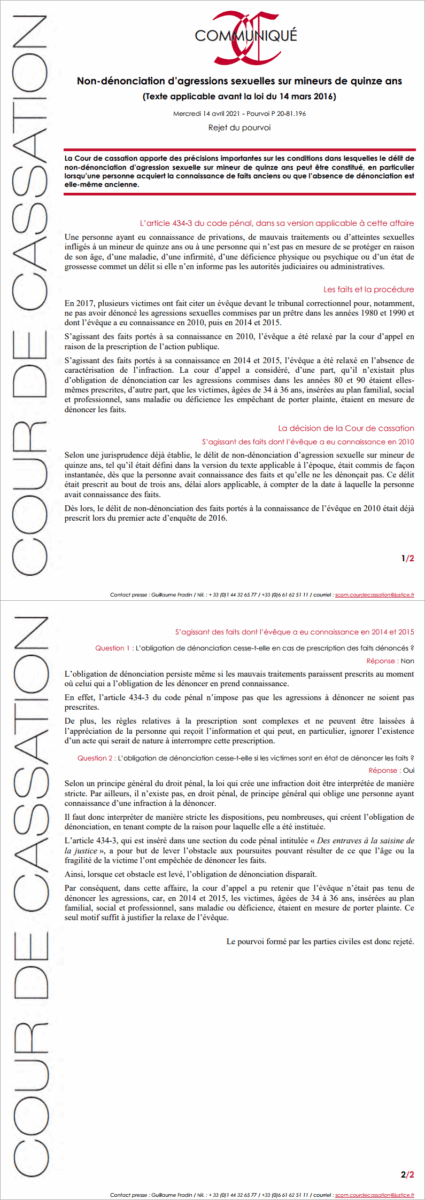 Le communiqué de la Cour de cassation est reproduit ci-dessous.