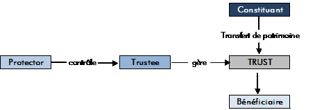 Le trust est un outil juridique qui permet à une personne, dénommée « constituant » (« settlor ») de confier un bien à une autre personne dénommée « trustee » (ou administrateur du trust) à charge pour celle-ci de le gérer et d’en faire bénéficier une troisième, le bénéficiaire, avant de le remettre à une quatrième, l’attributaire en capital. Il peut toutefois y avoir mélange de ces différentes qualités et plusieurs trustees ou bénéficiaires.