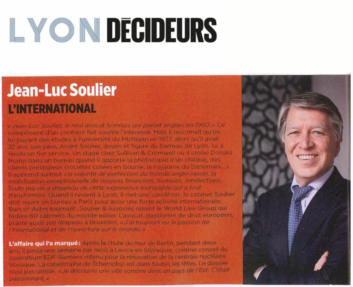 Jean-Luc Soulier a fait l’objet d’un portrait dans le dossier spécial “Les 30 avocats les plus influents de Lyon” publié par Lyon Décideurs, le média des pouvoir lyonnais.