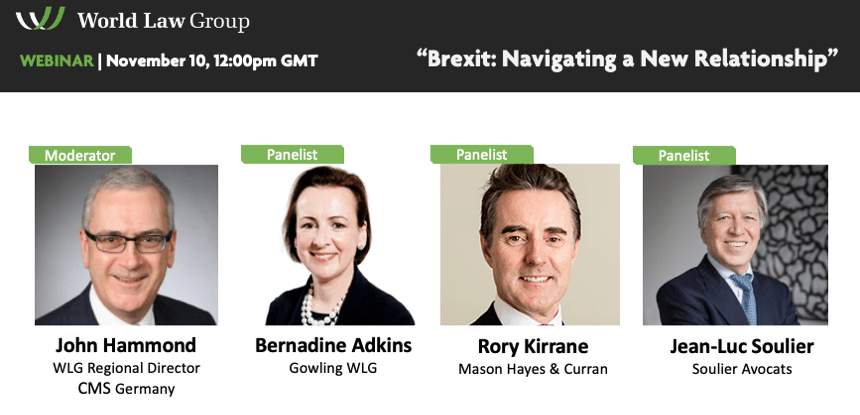 Jean-Luc Soulier interviendra en qualité de panéliste lors d’un webinar en ligne intitulé « Brexit: Navigating a New Relationship » organisé dans le cadre de l’e-conférence d’automne du World Law Group, un réseau de 59 grands cabinets d’avocats indépendants disposant de plus de 400 bureaux situés dans toutes les grandes places commerciales et financières à travers le monde, auquel notre cabinet appartient.